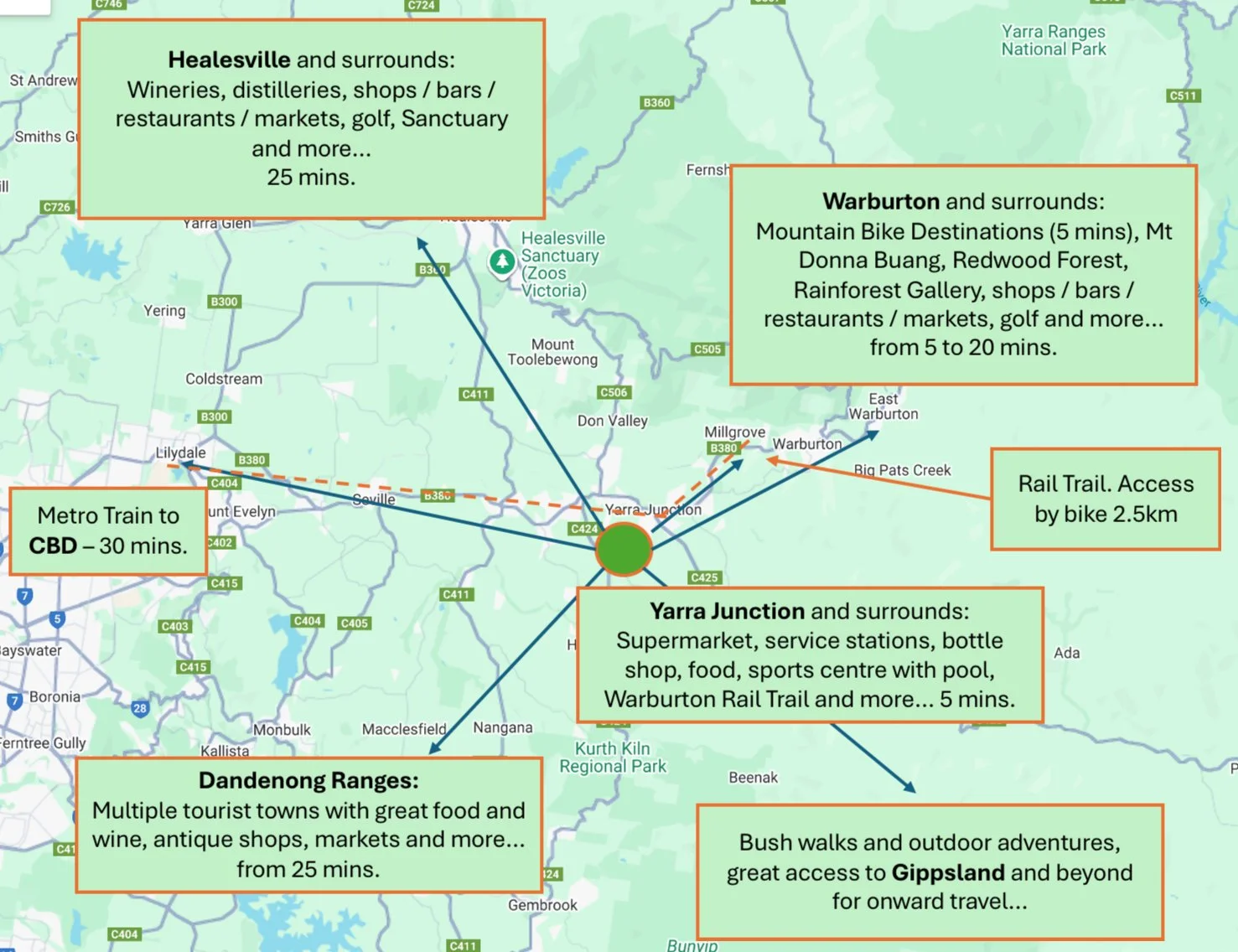 Located in Yarra Junction - as the name suggests we are at the crossroad of multiple holiday choices: